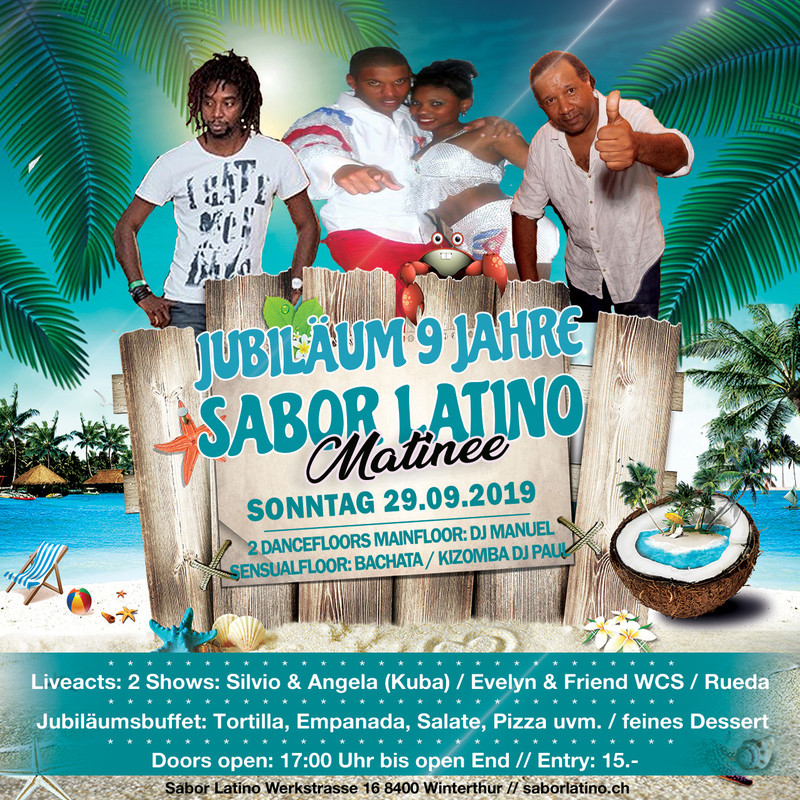 Schon seit 9 Jahren gibt es das Sabor Latino Matinee in Winterthur. Das muss doch gebührend gefeiert werden. Wir haben einiges vorbereitet, um mit Euch einen unvergesslichen Nachmittag zu verbringen. 17:00 - 18:00 Uhr: Rueda-Workshop mit Silvio und Angela aus Kuba ab 19:00 Uhr: Live Acts mit Silvio und Angela aus Kuba Evelyn und Partner mit Westcoastswing Rueda für Alle Verlosung: Memberkarte für 3 Monate Jubiläumsbuffet: Empanadas, Tostones, Pizza,uvm, Salate, feine Desserts Main Floor: DJ Manuel mit Salsa, Bachta, Merengue y mas 2nd Floor ab 18:00 Uhr: DJ Paul mit Kizomba und Bachata Entry: 15.- Wir freuen uns auf euch. Gratis-Parkplätze vor dem Club (free parking in front of the club)