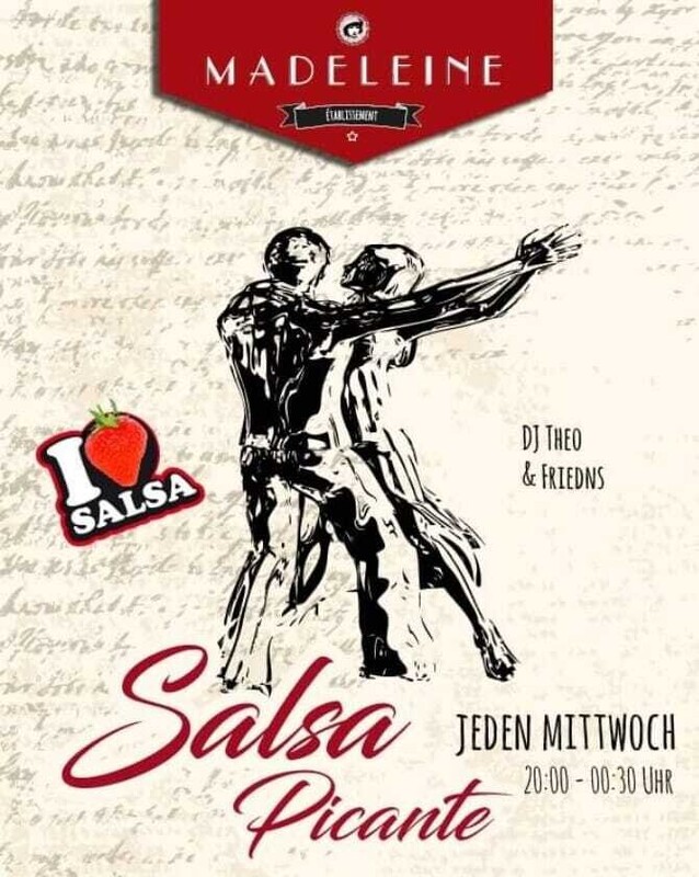 Jeden Mittwoch ★ SALSA PICANTE ★ mit 2 Dance Floors ★★ SALSA PICANTE ★★ ‼️Jeden Mittwoch Herzlich Willkommen im Madeleine ‼️ ★ Türöffnung 20:00h & Party bis 00:30h ★ Eintritt Frei ★ Salsa Floor (Club) mit DJ Theo ★ Bachata Floor (Beiz) Playlisten ★ Deejay Theo in the Mix ★ Salsa All Styles ★ Bachata All Styles ★ Latin Hits ★ MADELEINE MUSIKTHEATER, Baselstrasse 15, 6003 Luzern ★ www.lamadeleine.ch ★ www.parking-luzern.ch ★ Bus: Linie 2, 9, 12 oder 18 bis Kasernenplatz Tanz zu Salsa All Styles, Bachata, oder Merengue. Madeleine feiert die Lateinamerikanische Lebensfreude, das Highlight für tanzende mit Feuer im Arsch und Sinnlichkeit in den Bewegungen. DJ Theo spielt die Perlen aus der Latino Welt. Unser Sonnenscheinanlass am Mittwoch-Abend - wie Urlaub im Süden, und dies inmitten von Luzern.