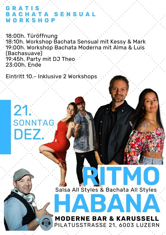 im Zentrum von Luzern ★ JEDEN SONNTAG ★ 18:00 Uhr bis 23:00 Uhr ★ RITMO HABANA ★ Salsa Cubana & Salsa Puertoriqueña, Bachata all Styles, Son & Cha Cha mit DJ Theo -------------------------------------------------------- PROGRAMM: > 18:00 Uhr Türöffnung und Musik mit DJ Theo > 18:10 Uhr Bachata Sensual Workshop mit Kesse & Mark >19:00 Uhr Bachata Moderna Workshop mit Alma & Luis (Bachasuave) > 19:45 Uhr Party mit DJ Theo > 23:00 Uhr Party Ende --------------------------------------------------------- 18.00 Uhr bis 23.00 Uhr I Eintritt 10.- (NUR BARZAHLUNG) Im MODERNE trifft man sich an der Bar oder im Karussell im ehemaligen Kinosaal. MODERNE BAR & KARUSSELL Pilatusstrasse 21, 6003 Luzern, www.modernekarussell.ch ---------------------------------------------------------- WIE FINDEN SIE UNS: ------------------------- AUTO: Parkhaus Kantonalbank, 100 Meter Bahnhofparking P1+P2, 200 Meter BUS: Buslinie Nr. 1 ab Bahnhof Luzern - Kantonalbank (1 Station) ZUG: 200 Meter, vier Gehminuten ab Hauptbahnhof Luzern FACEBOOK: https://fb.me/e/6M7x9NaJX