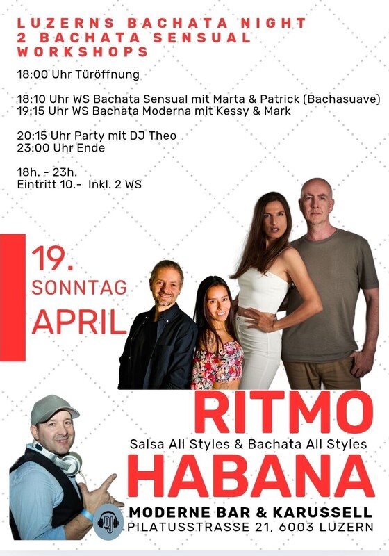 im Zentrum von Luzern ★ JEDEN SONNTAG ★ 18:00 Uhr bis 23:00 Uhr ★ RITMO HABANA ★ Salsa Cubana & Salsa Puertoriqueña, Bachata all Styles, Son & Cha Cha mit DJ Theo -------------------------------------------------------- PROGRAMM: > 18:00 Uhr Türöffnung und Musik mit DJ Theo > 18:10 Uhr WS Bachata Sensual mit Marta & Patrick (Bachasuave) > 19:15 Uhr WS Bachata Moderna mit Kessy & Mark > 20:15 Uhr Party mit DJ Theo > 23:00 Uhr Party Ende --------------------------------------------------------- 18.00 Uhr bis 23.00 Uhr I Eintritt 10.- (NUR BARZAHLUNG) Im MODERNE trifft man sich an der Bar oder im Karussell im ehemaligen Kinosaal. MODERNE BAR & KARUSSELL Pilatusstrasse 21, 6003 Luzern, www.modernekarussell.ch ---------------------------------------------------------- WIE FINDEN SIE UNS: ------------------------- AUTO: Parkhaus Kantonalbank, 100 Meter Bahnhofparking P1+P2, 200 Meter BUS: Buslinie Nr. 1 ab Bahnhof Luzern - Kantonalbank (1 Station) ZUG: 200 Meter, vier Gehminuten ab Hauptbahnhof Luzern