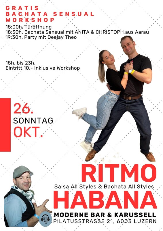 im Zentrum von Luzern Jeden Sonntag ab 18:00 Uhr bis 23:00 Uhr ★ RITMO HABANA ★ Salsa Cubana & Salsa Puertoriqueña, Bachata all Styles, Son & Cha Cha mit DJ Theo -------------------------------------------------------------- PROGRAMM: > 18:00 Uhr Türöffnung und Musik mit DJ Theo > 18:30 Uhr Gratis Workshop Bachata Sensual mit ANITA & CHRISTOPH aus Aarau > 19:30 Uhr Party Beginn > 23:00 Uhr Party Ende --------------------------------------------------------------- 18.00 Uhr bis 23.00 Uhr I Eintritt 10.- (NUR BARZAHLUNG) Im MODERNE trifft man sich an der Bar oder im Karussell im ehemaligen Kinosaal. MODERNE BAR & KARUSSELL Pilatusstrasse 21, 6003 Luzern, www.modernekarussell.ch ---------------------------------------------------------------- WIE FINDEN SIE UNS: --------------------- AUTO: Parkhaus Kantonalbank, 100 Meter Bahnhofparking P1+P2, 200 Meter BUS: Buslinie Nr. 1 ab Bahnhof Luzern - Kantonalbank (1 Station) ZUG: 200 Meter, vier Gehminuten ab Hauptbahnhof Luzern FACEBOOK EVENT https://fb.me/e/32PKlQc5t FACEBOOK WORKSHOP https://fb.me/e/5URWRP89l