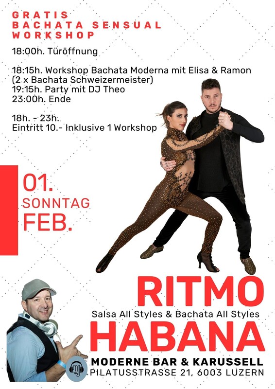 im Zentrum von Luzern ★ JEDEN SONNTAG ★ 18:00 Uhr bis 23:00 Uhr ★ RITMO HABANA ★ Salsa Cubana & Salsa Puertoriqueña, Bachata all Styles, Son & Cha Cha mit DJ Theo -------------------------------------------------------- PROGRAMM: > 18:00 Uhr Türöffnung und Musik > 18:15 Uhr Workshops Bachata Moderna mit Elisa & Ramon > 19:15 Uhr Party mit DJ Theo > 23:00 Uhr Party Ende --------------------------------------------------------- 18.00 Uhr bis 23.00 Uhr I Eintritt 10.- (NUR BARZAHLUNG) Im MODERNE trifft man sich an der Bar oder im Karussell im ehemaligen Kinosaal. MODERNE BAR & KARUSSELL Pilatusstrasse 21, 6003 Luzern, www.modernekarussell.ch ---------------------------------------------------------- WIE FINDEN SIE UNS: ------------------------- AUTO: Parkhaus Kantonalbank, 100 Meter Bahnhofparking P1+P2, 200 Meter BUS: Buslinie Nr. 1 ab Bahnhof Luzern - Kantonalbank (1 Station) ZUG: 200 Meter, vier Gehminuten ab Hauptbahnhof Luzern