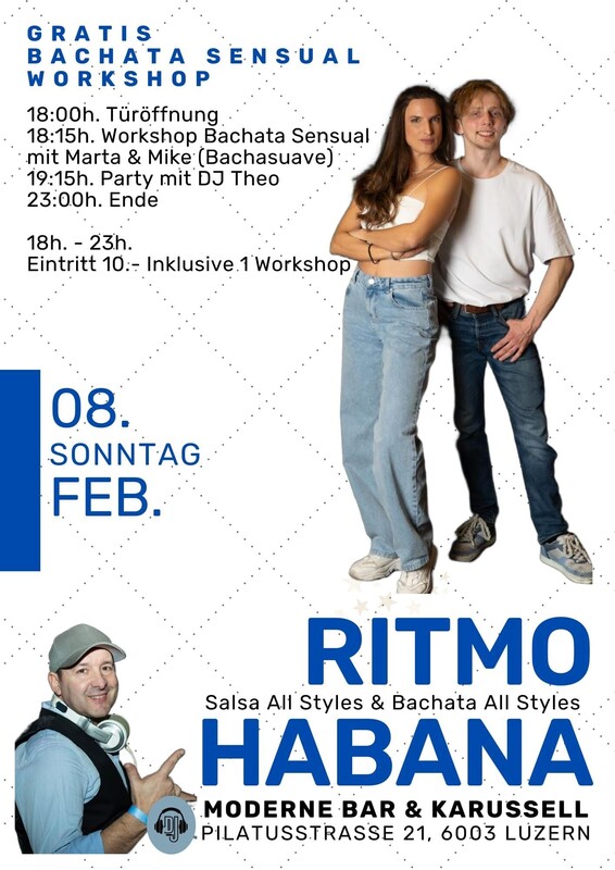 im Zentrum von Luzern ★ JEDEN SONNTAG ★ 18:00 Uhr bis 23:00 Uhr ★ RITMO HABANA ★ Salsa Cubana & Salsa Puertoriqueña, Bachata all Styles, Son & Cha Cha mit DJ Theo -------------------------------------------------------- PROGRAMM: > 18:00 Uhr Türöffnung und Musik mit DJ Theo > 18:15 Uhr Workshop Bachata Sensual mit Marta & Mike (Bachasuave) > 19:15 Uhr Party mit DJ Theo > 23:00 Uhr Party Ende --------------------------------------------------------- 18.00 Uhr bis 23.00 Uhr I Eintritt 10.- (NUR BARZAHLUNG) Im MODERNE trifft man sich an der Bar oder im Karussell im ehemaligen Kinosaal. MODERNE BAR & KARUSSELL Pilatusstrasse 21, 6003 Luzern, www.modernekarussell.ch ---------------------------------------------------------- WIE FINDEN SIE UNS: ------------------------- AUTO: Parkhaus Kantonalbank, 100 Meter Bahnhofparking P1+P2, 200 Meter BUS: Buslinie Nr. 1 ab Bahnhof Luzern - Kantonalbank (1 Station) ZUG: 200 Meter, vier Gehminuten ab Hauptbahnhof Luzern