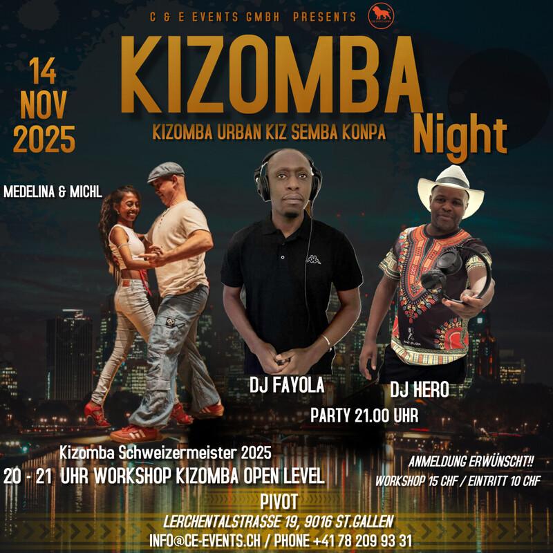 Welcome to Kizomba Night in St. Gallen den Freitag 14. November Liebe Kiz-Freunde, wir haben in St. Gallen eine schöne, gemütliche Location wo wir einmal im Monat Kizomba und Urban Kiz in allen Stilrichtungen tanzen können Die Location verfügt über einen großen Raum mit gutem Parkett-Tanzboden und große Fenster, die wir bei jedem Wetter öffnen können. 20.30 Uhr Workshop Kizomba Open Level mit Medelina & Michl Kizomba Schweizermeister 2026 21.30 Uhr Party mit DJ Fayola und 𝐃𝐉 HERO mit Kizomba Urban Kiz Konpa Tarraxinha Anmeldung Workshop erwünscht. info@ce-events.ch oder Phone +41 78 209 93 31 / www.ce-events.ch Die Anmeldung hilft uns dabei, das Gleichgewicht zwischen Leader und Follower besser zu koordinieren. Fʀᴇᴇ Pᴀʀᴋɪɴɢ Workshops & Party Ort: Pivot Lerchentalstr. 19 9016 St. Gallen Wir freuen uns auf einen schönen Abend mit Euch!!! www.ce-events.ch