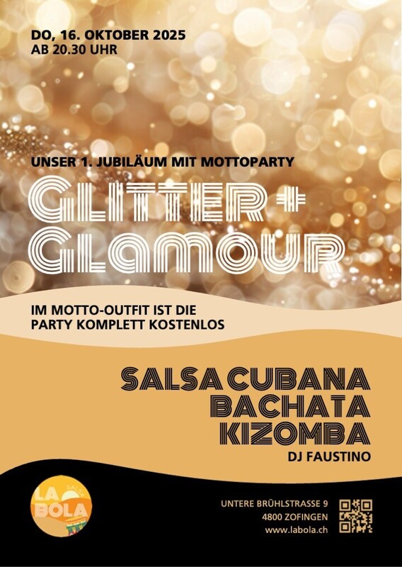 Im Motto-Outfit *Glitter & Glamour" ist die Party komplett kostenlos. Salsa Cubana - Bachata - Kizomba www.labola.ch