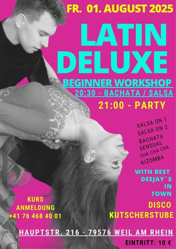 Latin Deluxe 20:30 Workshop Salsa & Bachata (Crashkurs) 21:00 Salsa & Bachata Party DJ - Pietro Eintritt 10 CHF Disco Kutscherstube Hauptstraße 216, 79576 Weil am Rhein, Deutschland (Grenze zu Basel) https://share.google/78OiQFiqy6dM03e4h