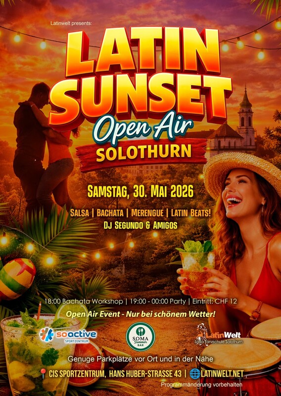 ⚠️ Der Event findet nur bei schönem Wetter statt. 👈🏽 Latinwelt präsentieren: Latin Sunset – Open Air Solothurn ☀️ Starte stilvoll ins Wochenende mit heissen Latin Vibes unter freiem Himmel! Erlebe eine unvergessliche Sommernacht mit guter Musik, tollen Menschen und einzigartiger Atmosphäre im Herzen von Solothurn. 💃🕺 Egal ob Anfänger oder Profi – bei uns ist jeder willkommen! Komm vorbei, tanze, geniesse einen Drink und lass dich von der Musik mitreissen. ⏰ Programm 18:00 Bachata Workshop 19:00 – 00:00 Party 🎶 Salsa | Bachata | Merengue | Latin Beats 🎧 DJ Segundo & Amigos 📅 Samstag, 30. Mai 2026 📍 CIS Sportzentrum, Hans Huber-Strasse 43, Solothurn 💸 Eintritt: CHF 12.– 💃🏼 CHF 22.- Workshop + Party 🌤️ Open Air Event – nur bei schönem Wetter 🚗 Genügend Parkplätze vor Ort und in der Nähe 👉 Schnapp dir deine Freunde und erlebe einen unvergesslichen Latin-Abend! Anmeldung nicht zwingend.