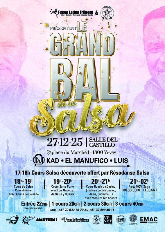 À tous les aficionados de la Salsa, qu'elle soit Cubaine, Portoricaine, Colombienne, Africaine ou autre, Salseros ou Latinos, nous vous donnons rendez-vous dans la magnifique Salle du Castillo de Vevey le 27 Décembre 2025. Aux platines 3 vieux Briscards qui vous font danser depuis plus de 20 ans sur le meilleur de la Salsa DJ KAD (Fuego Latino Fribourg), LUIS (Salsa y Dulzura) & EL MANUFICO (Résodanse Salsa) pour vous régaler les oreilles et vous faire danser toute la nuit. L'Unique grand évènement 100% dédié à la Salsa. Ne manquez sous aucun prétexte ce grand rendez-vous de la Salsa. Pour l'occasion et parce que nous sommes dans une période de fête, DRESS CODE: Élégant! https://www.resodanse-salsa.ch/news/