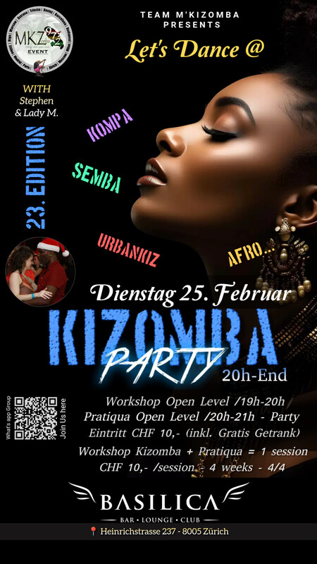 Ladies & Gentlemen, Are you ready? *Next Tuesday 25th February* 💃🏻🕺🏾 _Because we love Basilica!_ Let's Dance & warm up this Beautiful place one more time... 🫂❤‍🔥 Program : 4 weeks = 4 sessions (CHF 10,-/session) 4th Session: Leading 7pm-8pm : Workshop Open Level 8pm-9pm : Pratiqua Open Level 8pm-End : Let's Dance ... Kizomba Semba Kompa & more Entrance : CHF 10,- incl. one soft drink Gratis https://fb.me/e/2R8zqhbJ5 See you there on the dancefloor 🥳 ❤️‍🔥 _Team M'KiZomba_ ❤‍🔥 https://chat.whatsapp.com/HsxkUKNIes12w7zsCfPyzv
