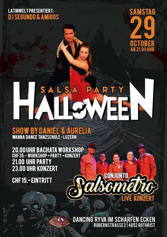 Latin Welt presentiert: ★★Halloween Salsa Party mit Live Salsa Konzert♪♪♪ ★SPECIAL SHOW BY DANIEL & AURELIA (Swiss Salsa Champions 2016) (Wanna Dance Tanzschule Luzern) ★Conjunto Salsometro "Live Konzert" ★Verkleidet oder nicht, es sind alle Willkommen!★ ★PROGRAMM 20.00 Uhr Bachata Workshop 21.00 Uhr Party mit Dj 23.00 Uhr Salsa Konzert 03.00 Uhr Party Ende ★PREISE CHF 15.- Eintritt Party Inkl. Salsa Konzert (VVK) CHF 20.- Eintritt Party Inkl. Salsa Konzert (AK) CHF 35.- Party + Workshop Haben Sie eine Latinweltkarte oder Latino Card gewähren wir Ihnen gerne einen Discount. ★Reservationen, Anmeldungen und Informationen: info@latinwelt.net I 078 800 49 12 I www.latinwelt.net ★Parkett Tanzboden - über 280 Gratis Parkplatz Wir freuen uns schon auf dieses neue Ereignis! Segundo Valencia 078 800 49 12 - info@latinwelt.net