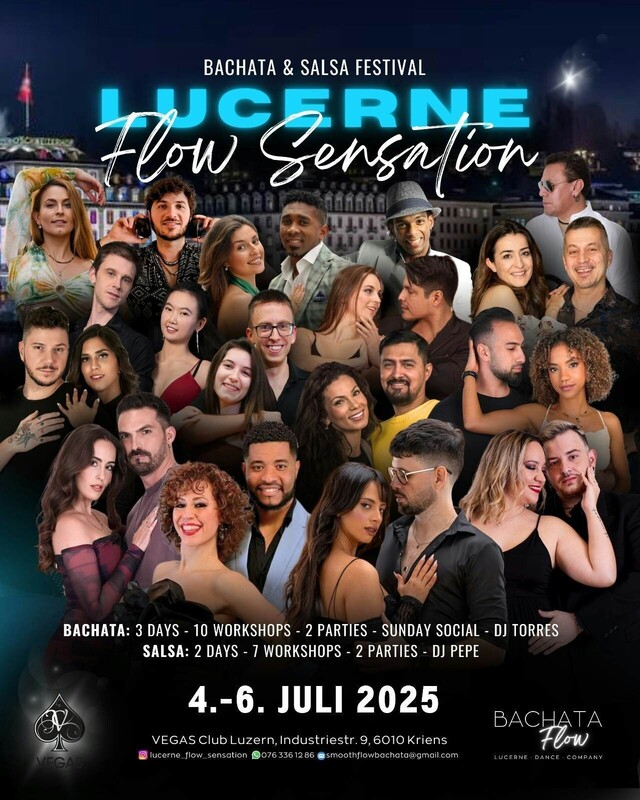 Lucerne Flow Sensation - Bachata & Salsa Festival Welcome to the 2nd edition of LUCERNE FLOW SENSATION - Lucerne's first Bachata & Salsa Festival! Get ready for an unforgettable 3-day event! Join us for Bachata & Salsa Workshops, 2 Parties, and a Sunday Social —all hosted at the iconic Vegas Club in Lucerne (Switzerland), featuring a 100% Bachata floor and a 100% Salsa floor. BACHATA LINEUP International Artists: - Tom & Daniel - Mcarmen & Vizcaino Swiss Artists: - Svenja & Tony - Xidan & Ale - Linda & Flavio - Jenny & Dan - Elisa & Ramon - DJ Torres - DJ Wolff SALSA LINEUP - Simosura & Felipe - Aurelia & Daniel - Tahyra & Yermani - Diyana & Damian - Gina & Noel - Montse & Elior - Andrea Gabriela - DJ Pepe PROGRAM Friday, July 4: 19:00 Doors Opening 20:00 - 22:00 Salsa & Bachata Pre-Party Workshops 22:00 - open-end Party with 100% Bachata Floor & 100% Salsa Floor Saturday, July 5: 13:00 - 18:00 Bachata & Salsa Workshops 21:00 - 22:00 Bachata & Salsa Pre-Party Workshops 22:00 - open-end Party with 100% Bachata Floor & 100% Salsa Floor Sunday, July 6: 14:00 - 18:00 Bachata Workshops 18:00 - 00:00 Bachata Sunday Social (no Salsa floor on Sunday) Let's bring the dance scene to life in the heart of Switzerland! Tickets & Program: https://www.goandance.com/es/evento/7764/lucerne-flow-sensation-bachata-salsa-festival-2a-edicion Instagram: https://www.instagram.com/lucerne_flow_sensation/ https://www.goandance.com/es/evento/7764/lucerne-flow-sensation-bachata-salsa-festival-2a-edicion