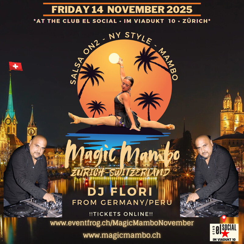 **Salsa On2 - NY Style - Mambo** ----------------- Music by DJ Flori (Berlin/Peru) ----------------- Tickets: www.eventfrog.ch/MagicMamboNovember !Limited Capacity! ----------------- Info: www.magicmambo.ch www.magicmambo.ch