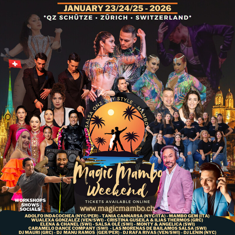 MagicMambo Weekend Zurich, Switzerland QZ Schütze, Heinrichstrasse 238, 8005 Zürich January 23/24/25, 2026 1 Bootcamp (Friday-Saturday) 2 Days of Workshops (Saturday-Sunday) 3 Socials (Friday-Saturday-Sunday) Our last edition was awesome ! You don't want to miss the next one! Join us for our next MagicMambo Weekend to learn, enjoy and dance together! Tickets: www.eventfrog.ch/MagicMamboWeekend More Info: www.magicmambo.ch Line up - Dancers: -Tania Cannarsa (NYC/ITA) -Adolfo Indacochea (NYC/PER) -Mambo Gem - Davide Pucci & Shahram Shahroozi (ITA) -Wualexa Gonzalez (SWI) -Elena & Chanel (SWI) -Salsa Olé (SWI) -Caramelo DC (SWI) -Monty & Angelica (SWI) -Las Morenas de Bailamos Salsa (SWI) Line up - DJs: -Mauri (GRC) -Manu Ramos (GER/PER) -Lenin (NYC) -Rafa Rivas (SWI) >> Socials Friday + Saturday: 21:00-2:00 >> Social Sunday: 15:00-18:00 >> Workshops Saturday: 13:00-17:00 >> Workshops Sunday: 10:30-15:00 >> Bootcamp: -Friday 17:30-20:00 -Saturday 10:30-13:00 (show optional at approx. 23:00 during social) -A video will be shared a few weeks before for self study **Tentative program - might be subject to change** www.magicmambo.ch