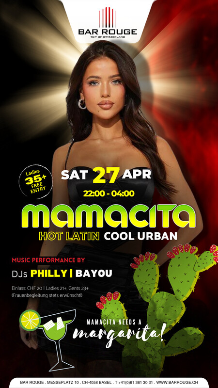 Arrrribaaa!! Diese Party ist schärfer als das mexikanische Essen! Komm und schwinge mit uns die Hüften zu den heissesten Latin Sounds der City. Wir wissen ganz genau wie heissblütig unsere Partygäste sind, weswegen es zur Abkühlung coolen Urban Sound & die besten Cocktails hoch über den Dächern von Basel gibt. https://www.barrouge.ch/de/events/mamacita27042024/