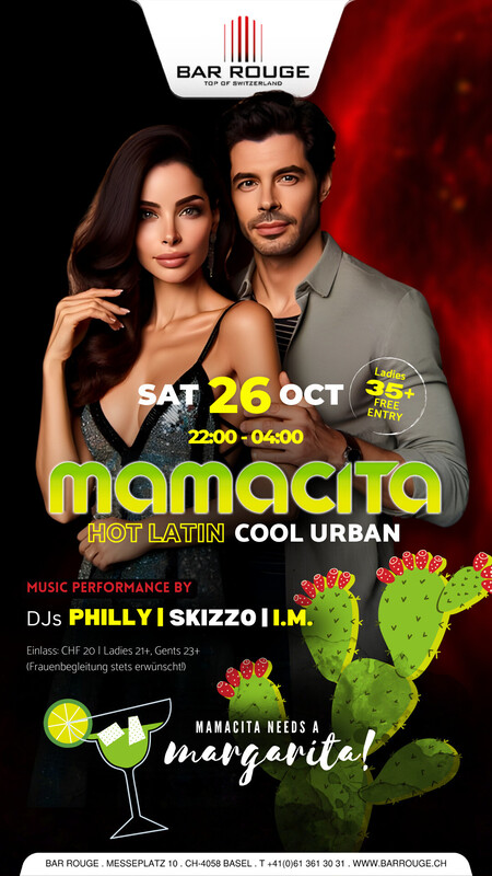 Arrrribaaa!! Diese Party ist schärfer als das mexikanische Essen! Komm und schwinge mit uns die Hüften zu den heissesten Latin Sounds der City. Wir wissen ganz genau wie heissblütig unsere Partygäste sind, weswegen es zur Abkühlung coolen Urban Sound & die besten Cocktails hoch über den Dächern von Basel gibt. Music: HOT LATIN & COOL URBAN https://www.barrouge.ch/de/events/mamacita26102024/