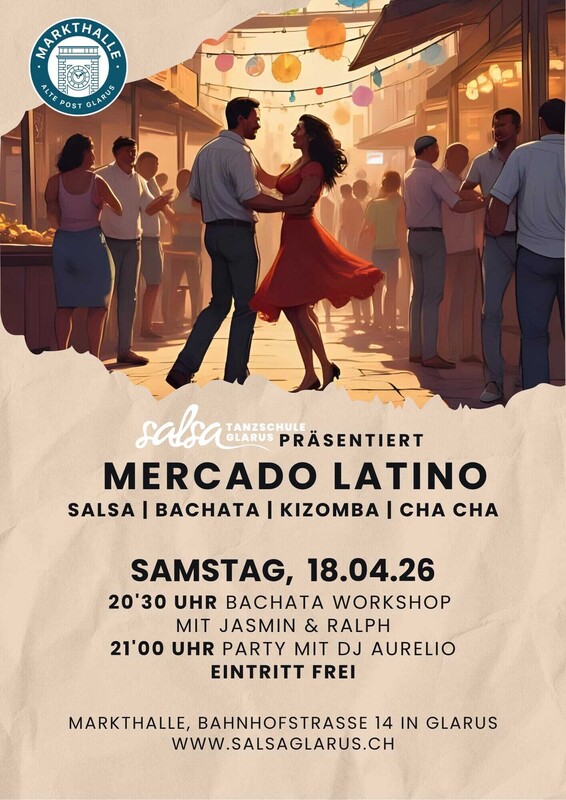 SalsaGlarus Events Markthalle Glarus 1 eventos 18 de abril de 2026 20:30 MERCADO LATINO Salsa/Bachata/Kizomba/ChaCha 20:30 Bachata Workshop mit Jasmin & Ralph 21:00 Party mit DJ Aurelio Precio de entrada: CHF 0.00 Share on Facebook Eventos sáb, 18. abr 20:30 MERCADO LATINO Salsa/Bachata/Kizomba/ChaCha Markthalle Glarus Glarus