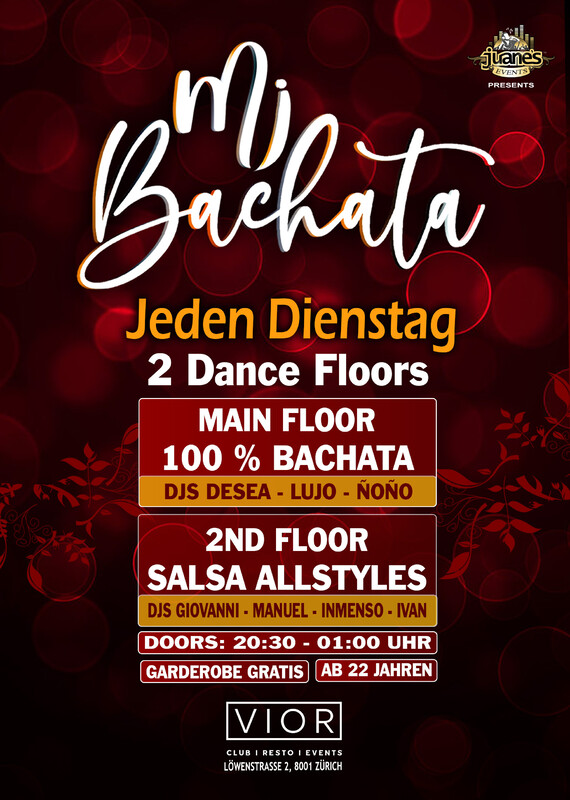 ♦ MI BACHATA ♦ Dienstags 100% Bachata 2 Floors VIOR CLUB DIENSTAG 16. SEPTEMBER 25 ••• Unter der Woche darf unser romantischer und sinnlicher Tanz MI BACHATA im VIOR Club nicht fehlen. Jeden Dienstag verwandelt sich der Main Floor in ein Paradies für alle Bachateros – mit den besten DJs der Szene. Mit 2 Tanzflächen wird die Nacht im Herzen von Zürich einfach perfekt. ••• ♦ MAIN FLOOR: 100% BACHATA DJ GIOVANNI • Bachata Moderna, Fusion, Clasica y del Recuerdo. •••• ♦ 2ND FLOOR: SALSA ALLSTYLES DJ MANUEL • Salsa Allstyles - Cubana - Clasica - Puertorriqueña •••• ♦ Doors: 20:30 bis 01:00 Uhr ♦ Garderobe Gratis ♦ Eintritt Party CHF 10.- Inkl. Garderobe •••• • EINTRITT: BEZAHLUNG AN DER KASSE NUR BARGELD. •••• Location: VIOR CLUB Löwenstrasse 2 8001 Zürich •••• Bienvenidos MI BACHATA by Juanes Events https://juanesevents.ch/2-0-Events.html
