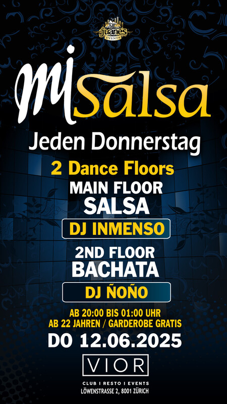 ► MI SALSA ◄ Jeden Donnerstag 2 Floors URBANVIOR Club by Juanes DONNERSTAG 12. JUNI 2025 ••• ► MAIN FLOOR: SALSA ALLSTYLES DJ INMENSO • Salsa Allstyles - Cubana - Clasica - Puertorriqueña •••• ► 2ND FLOOR: BACHATA DJ ÑOÑO • Bachata Moderna, Fusion, Clasica y del Recuerdo. ••• • AB 22 JAAB 22 JAHREN • 2 DANCE FLOORS • MIAN FLOOR SALSA ALLSTYLES • 2ND FLOOR 100% BACHATA • DOORS: 20:00 BIS 01:00 UHR • GARDEROBE GRATIS • EINTRITT PARTY CHF 10.- INKL. GARDEROBE ••• DJs MANUEL - YASSER - DESEA - GIOVANNI - ÑOÑO - IVAN ••• • EINTRITT: BEZAHLUNG AN DER KASSE NUR BARGELD. •••• BACHATA FLOOR: Die Bachata-Tanzfläche befindet sich im Untergeschoss, es ist eine grosse und gemütliche Tanzfläche für die Bachata-Tänzer. •••• GARDEROBE: Die Garderobe befindet sich im Untergeschoss, neben der Bachata-Tanzfläche (Garderobe ist gratis). •••• AUDIO TON: Das Audio ist perfekt, professioneller Sound eines echten Clubs. •••• Location: URBANVIOR CLUB Löwenstrasse 2 8001 Zürich •••• SEARCH MAP https://map.search.ch/Z%C3%BCrich,L%C3%B6wenstr.2 •••• Bienvenidos Mi Salsa by Juanes Events http://juanesevents.ch/