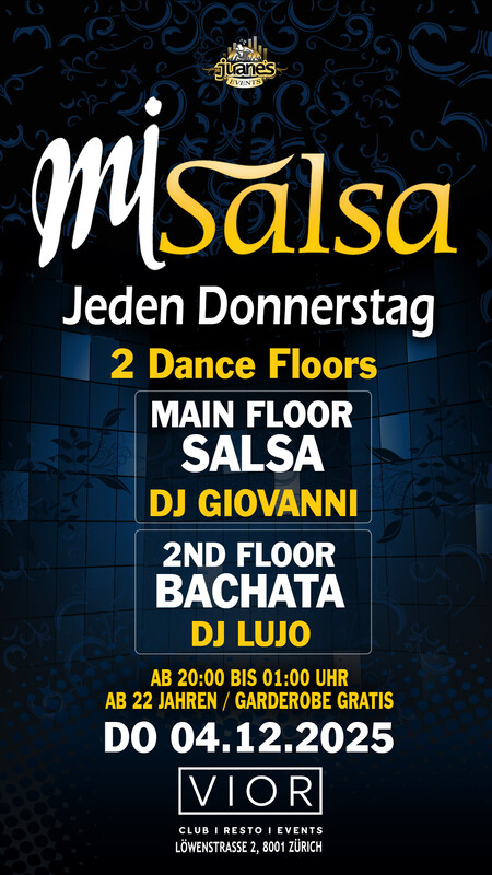 ► MI SALSA ◄ Jeden Donnerstag 2 Floors VIOR CLUB DONNERSTAG 04. DEZEMBER 2025 ••• ► MAIN FLOOR: SALSA ALLSTYLES DJ GIOVANNI • Salsa Allstyles - Cubana - Clasica - Puertorriqueña •••• ► 2ND FLOOR: BACHATA DJ LUJO • Bachata Moderna, Fusion, Clasica y del Recuerdo. •••• Gutschein im Wert von CHF 5.- für Dich für die Party am Samstag 06.12.25 bei CHRISTMAS PARTY der Bananenreiferei •••• • 2 Grosse Tanzflächen • Grosse Salsa Floor • Grosse Bachata Floor • Doors: 20:00 bis 01:00 Uhr • Garderobe Gratis • Eintritt Party CHF 10.- Inkl. Garderobe •••• • EINTRITT: BEZAHLUNG AN DER KASSE NUR BARGELD. •••• BACHATA FLOOR: Die Bachata-Tanzfläche befindet sich im Untergeschoss, es ist eine grosse und gemütliche Tanzfläche für die Bachata-Tänzer. •••• GARDEROBE: Die Garderobe befindet sich im Untergeschoss, neben der Bachata-Tanzfläche (Garderobe ist gratis). •••• AUDIO TON: Das Audio ist perfekt, professioneller Sound eines echten Clubs. •••• Location: VIOR CLUB Löwenstrasse 2 8001 Zürich •••• SEARCH MAP https://map.search.ch/Z%C3%BCrich,L%C3%B6wenstr.2 •••• Bienvenidos Juanes Events. https://juanesevents.ch/2-0-Events.html