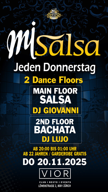 ► MI SALSA ◄ DJs Giovanni & Lujo Jeden Donnerstag 2 Floors VIOR CLUB DONNERSTAG 20. NOVIEMBRE 2025 ••• ► MAIN FLOOR: SALSA ALLSTYLES DJ GIOVANNI • Salsa Allstyles - Cubana - Clasica - Puertorriqueña •••• ► 2ND FLOOR: BACHATA DJ LUJO • Bachata Moderna, Fusion, Clasica y del Recuerdo. •••• • 2 Grosse Tanzflächen • Grosse Salsa Floor • Grosse Bachata Floor • Doors: 20:00 bis 01:00 Uhr • Garderobe Gratis • Eintritt Party CHF 10.- Inkl. Garderobe •••• • EINTRITT: BEZAHLUNG AN DER KASSE NUR BARGELD. •••• BACHATA FLOOR: Die Bachata-Tanzfläche befindet sich im Untergeschoss, es ist eine grosse und gemütliche Tanzfläche für die Bachata-Tänzer. •••• GARDEROBE: Die Garderobe befindet sich im Untergeschoss, neben der Bachata-Tanzfläche (Garderobe ist gratis). •••• AUDIO TON: Das Audio ist perfekt, professioneller Sound eines echten Clubs. •••• Location: VIOR CLUB Löwenstrasse 2 8001 Zürich •••• Bienvenidos Juanes Events.