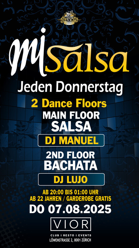 ► MI SALSA ◄ Jeden Donnerstag 2 Floors VIOR CLUB DONNERSTAG 07. AUGUST 25 ••• ► MAIN FLOOR: SALSA ALLSTYLES DJ MANUEL • Salsa Allstyles - Cubana - Clasica - Puertorriqueña •••• ► 2ND FLOOR: BACHATA DJ LUJO • Bachata Moderna, Fusion, Clasica y del Recuerdo. •••• • 2 Grosse Tanzflächen • Grosse Salsa Floor • Grosse Bachata Floor • Doors: 20:00 bis 01:00 Uhr • Garderobe Gratis • Eintritt Party CHF 10.- Inkl. Garderobe •••• • EINTRITT: BEZAHLUNG AN DER KASSE NUR BARGELD. •••• BACHATA FLOOR: Die Bachata-Tanzfläche befindet sich im Untergeschoss, es ist eine grosse und gemütliche Tanzfläche für die Bachata-Tänzer. •••• GARDEROBE: Die Garderobe befindet sich im Untergeschoss, neben der Bachata-Tanzfläche (Garderobe ist gratis). •••• AUDIO TON: Das Audio ist perfekt, professioneller Sound eines echten Clubs. •••• Location: VIOR CLUB Löwenstrasse 2 8001 Zürich •••• Bienvenidos Mi Salsa by Juanes Events.
