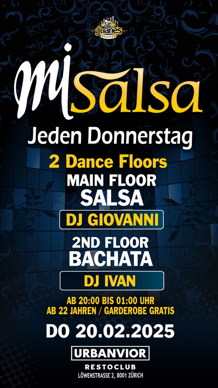 ► MI SALSA ◄ Jeden Donnerstag 2 Floors URBANVIOR Club by Juanes ••• ► MAIN FLOOR: SALSA ALLSTYLES DJ GIOVANNI • Salsa Allstyles - Cubana - Clasica - Puertorriqueña •••• ► 2ND FLOOR: BACHATA DJ IVAN • Bachata Moderna, Fusion, Clasica y del Recuerdo. ••• • AB 22 JAAB 22 JAHREN • 2 DANCE FLOORS • MIAN FLOOR SALSA ALLSTYLES • 2ND FLOOR 100% BACHATA • DOORS: 20:00 BIS 01:00 UHR • GARDEROBE GRATIS • EINTRITT PARTY CHF 10.- INKL. GARDEROBE ••• DJs MANUEL - YASSER - DESEA - GIOVANNI - ÑOÑO - IVAN ••• • EINTRITT: BEZAHLUNG AN DER KASSE NUR BARGELD. •••• BACHATA FLOOR: Die Bachata-Tanzfläche befindet sich im Untergeschoss, es ist eine grosse und gemütliche Tanzfläche für die Bachata-Tänzer. •••• GARDEROBE: Die Garderobe befindet sich im Untergeschoss, neben der Bachata-Tanzfläche (Garderobe ist gratis). •••• AUDIO TON: Das Audio ist perfekt, professioneller Sound eines echten Clubs. •••• Location: URBANVIOR CLUB Löwenstrasse 2 8001 Zürich •••• SEARCH MAP https://map.search.ch/Z%C3%BCrich,L%C3%B6wenstr.2 •••• Bienvenidos Mi Salsa by Juanes Events http://juanesevents.ch/