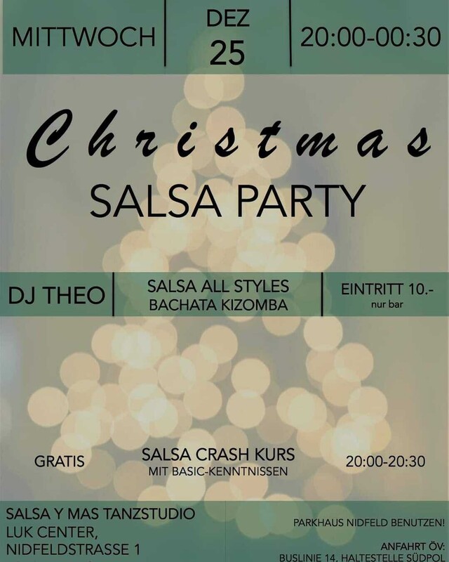 Mittwoch 25. Dezember 2024 CHRISTMAS SALSA & BACHATA PARTY Salsa All Styles und Bachata All Styles mit DJ THEO 2 Dance Floors Türöffnung 20:00 Uhr Eintritt 10.- (Nur Bargeld) inklusiv GRATIS Salsa Crash Kurs von 20:00-20:30 Uhr Beginn Party um 20:30 Uhr Salsa y mas Tanzstudio LUK CENTER, Nidfeldstrasse 1 6010 Kriens - Luzern ACHTUNG SEHR WICHTIG --------------------------- Bei Anreise mit Auto: Bitte Parkhaus Nidfeld nebenan benutzen. Parkieren auf dem Areal ist verboten! Bei Anreise mit ÖV: Haltestelle Südpol, Bus Linie 14 ------------------------------- Tanzschule Salsa y mas, Urbano Rodriguez Dubé. "El autentico estilo cubano!" Nidfeldstrasse 1, LUKcenter 6010 Kriens www.salsaymas.ch https://fb.me/e/2JgZh8mwo