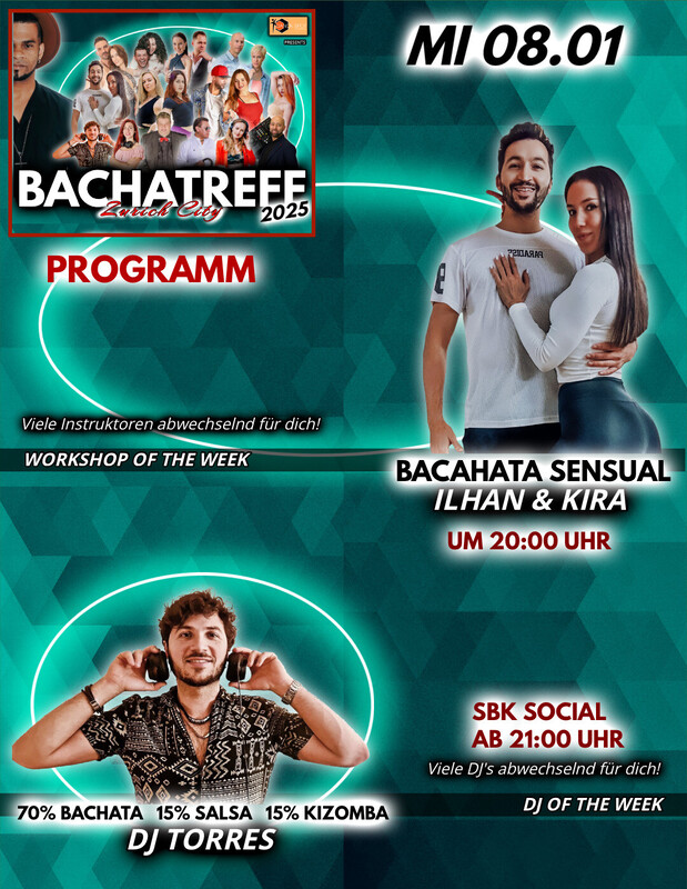 2025 ERWARTET EUCH BACHTREFF IM NEUEN FORMAT! Hola Bachateros & Bachateras! BACHATREFF öffnet seine Türen im neuen Jahr für euch mit einem neuen Konzept. Die Tanzszene in der Schweiz wächst und gedeiht. Es ist uns wichtig, euch die gewohnte Qualität des Events zu bieten, dabei aber auch die Vielfalt des aktuellen Angebots zu unterstützen, einen guten Austausch zwischen den Tänzern zu ermöglichen und auch vielversprechenden neuen Lehrern und Instruktoren die Möglichkeit zu geben, ihr Wissen und ihre Begeisterung für Bachata mit euch zu teilen. WHAT IS NEW: Für die Workshops haben wir viele verschiedene Instruktoren "in round" für euch. Auch für die anschliessende Party werden die DJs im Wochentakt rotieren. Zusätzlich haben wir unsere Preise zurück auf den ursprünglichen Eintrittspreis angepasst. Bachatreff ist ein von Dance Spot Zürich organisiertes Event, welches jeden Mittwoch in Zürich stattfindet. Seit nun bereits mehr als 7 Jahren bringen wir neue Tänzer auf die Tanzflächen. Make it your second home! _________________________________________________________ WOCHENPLAN *************** ° 20:00 BACHATA SENSUAL by Ilhan & Kira _________________________________________________________ ° 21:00 SBK SOCIAL 70% Bachata 15% Salsa 15% Kizomba by DJ Torres _________________________________________________________ ° NEUER EINTRITTSPREIS Workshop + Party Pass 25.- Party Pass 10.- _________________________________________________________ ° LOKAL Labor 5 Club Schiffbaustrasse 3 8005 Zurich https://www.facebook.com/share/15FoVt8uuG/