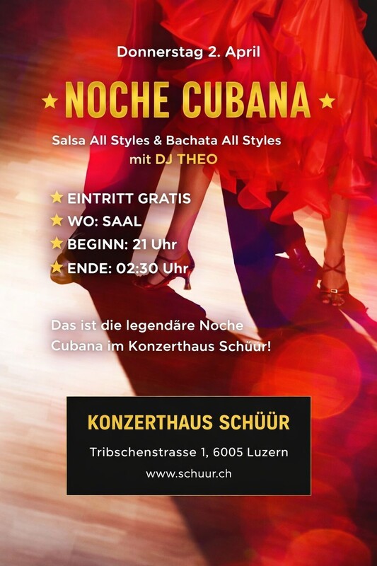 - Donnerstag 2. April - ★ NOCHE CUBANA ★ Salsa All Styles & Bachata All Styles mit DJ THEO ★ EINTRITT GRATIS ★ WO: SAAL ★ TÜRÖFFNUNG: 21:00 ★ BEGINN: 21:00 ★ ENDE: 02:30 Das ist die legendäre Noche Cubana im Konzerthaus Schüür! KONZERTHAUS SCHÜÜR Tribschenstrasse 1, 6005 Luzern www.schuur.ch Facebook: https://fb.me/e/4mlpFSesH