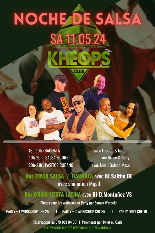 Salsa Cubana mit einem Schuss Bachata im Kheops Club in Martigny, Wallis. Ab 18 Uhr diverse Workshops, ab 21.30 Uhr Party mit DJ Saltho und ab 01.00 Uhr Fiesta Latina mit DJ D. Montañez.