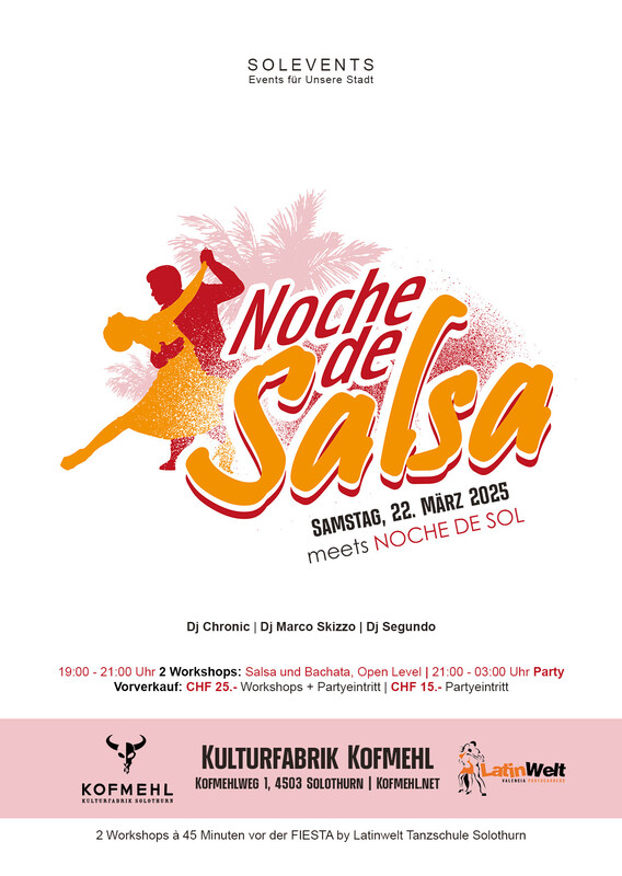 SALSA, BIS DIE WÄNDE WACKELN! NOCHE DE SALSA meets NOCHE DE SOL! Hola Salsera! Hola Salsero! Die Noche de Salsa! Während bei Noche de Sol der Reggaeton und alle erdenklichen Latino-Musikstile wild durcheinander gemixt werden, gibts bei der Noche de Salsa nur eines: Salsa und Bachata von A – Z bis Mitternacht. Die Noche de Salsa ist mehr als eine normale Party. Salsa ist zugleich Musikstil und Tanz. Wiederum startet die Noche de Salsa mit 2 Workshops. Ab 21:00 Uhr versprühen die DJ’s heisse Salsarhythmen, bis die Wände wackeln. Zudem wartet eine sommerliches Ambiente auf dich. Und wenn dir das leidenschaftliche Tanzen Schweissperlen auf die Stirne treibt, ist der Weg zur Bar nicht weit, wo erfrischende Drinks auf dich warten. PROGRAMM 19:00 - 19:50 Salsa Workshop | Open Level 20:00 - 20:50 Bachata Workshop | Open Level 21:00 - 23:59 NOCHE DE SALSA: Salsa, Bachata... all Style. 00:00 - 03:00 NOCHE DE SOL: Reggaeton, Hits Latino. PREISE CHF 25.- | 2 Workshops (Inkl. Party) CHF 15.- | Party https://www.latinwelt.net/p/party.html