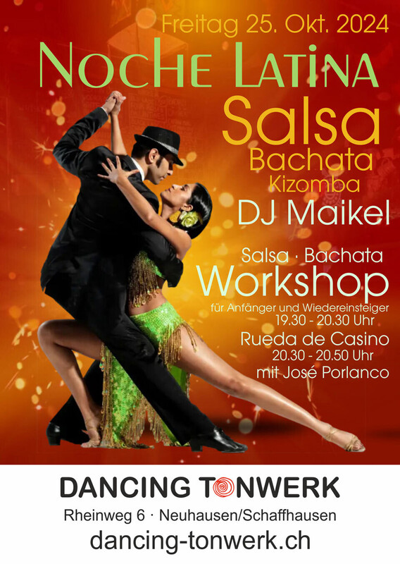 Noche Latina Mit viel Salsa garniert mit etwas Bachata und Kizomba ab 21 Uhr mit DJ Maikel Eintritt: Fr./€ 15.- Salsa · Bachata Workshop mit José Porlanco für Anfänger ohne Vorkenntnisse und Wiedereinsteiger. Keine Anmeldung erforderlich! von 19.30 - 20.30 Uhr Workshop mit Party-Eintritt Fr./€ 25.- Rueda de Casino mit José Porlanco von 20.30 - 20.50 Uhr im Party-Eintritt enthalten dancing-tonwerk.ch