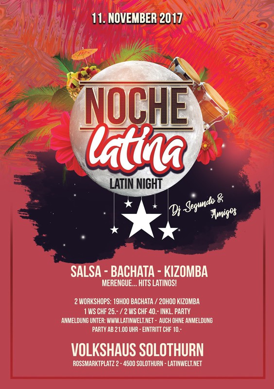 Latinwelt präsentiert "NOCHE LATINA" Salsa, Bachata, Kizomba... Latin Hits! Dj Segundo & Amigos 2 Workshops / Djs / Party / Animation Zeit zum Geniessen! Zeit zum Feiern! ★Zeit: 19.00 - 19.50 Uhr Workshop Bachata 20.00 - 20.50 Uhr Workshop Kizomba 21.00 - 01.30 Uhr Party ★Preis CHF 10.- Eintritt CHF 25.- 1 Workshop + Party CHF 40.- 2 Workshops + Party ★Informationen: - Tanzflächen, Holzboden - 5 Minuten zu Fuss vom Hauptbahnhof Solothurn - Verschiedene Parkmöglichkeiten (z.B. Parkhaus Dornacherplatz 2 Minuten, Parkhaus Berntor 6 Min.) ★ Samstags: 11. November / 9. Dezember 2017 Wir freuen uns schon auf dieses neue Ereignis!