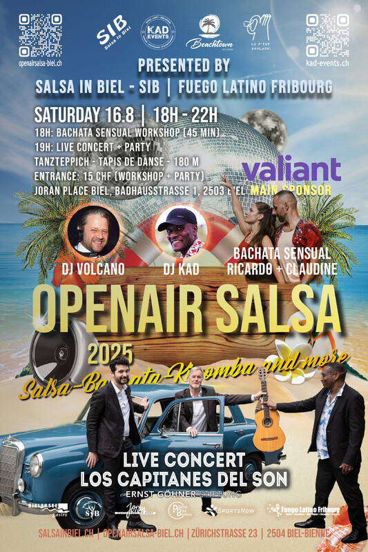 Wir sind begeistert, euch mitteilen zu dürfen, dass das jährliche Openair Salsa dieses Jahr wieder stattfinden wird! Doch das ist noch nicht alles - wir haben neu dieses Jahr 3 verschieden Standorte! Es wird eine grossartige Gelegenheit sein, unter freiem Himmel zu tanzen, die pulsierenden Rhythmen der SBK-Musik zu geniessen und gemeinsam unvergessliche Momente zu erleben. Egal, ob ihr Anfänger seid oder schon erfahrene Tänzer, unsere Veranstaltungen sind für alle geeignet, die die Leidenschaft für Salsa, Bachata und Kizomba teilen. Wir freuen uns schon jetzt darauf, euch zahlreich wieder an unserem Openair Salsa in Biel willkommen zu heissen. Lasst uns gemeinsam die Tanzfläche zum Beben bringen und eine unvergessliche Zeit erleben! Wir sind stolz anzukündigen, dass die DJ Kad, DJ Volcano, DJ Bomba und DJ Salsero erneut die Bühne rocken werden! Mit ihrer einzigartigen Auswahl an Songs und ihrem Talent, die Menge zum Tanzen zu bringen, werden sie die Nacht zum Leuchten bringen. Lasst uns gemeinsam die Magie des Salsa, Bachata und Kizomba erleben und die schöne Sommerzeit geniessen! Wir freuen uns darauf, euch zahlreich bei unserem Openair Salsa in Biel willkommen zu heissen. 🎶💃🕺 Daten: 21.6, 19.7, 9.8.2025 - Stadtpark Biel Adresse: Bubenberg-Strasse 53, 2502 Biel GOOGLE MAP Daten: 28.6.2025 - Beachtown Adresse: Strandboden, 2500 Biel GOOGLE MAP Daten: 5.7, 16.8.2025 - Joran Platz Adresse: Badhausstrasse 1, 2503 Biel GOOGLE MAP Eintritt: CHF 10.- ohne Liveband | CHF 15.- mit Liveband ----- 🇫🇷 🇫🇷 🇫🇷 🇫🇷 ----- Nous sommes ravis de vous annoncer que l’Openair Salsa annuel aura de nouveau lieu cette année ! Et ce n’est pas tout — pour la première fois, nous avons trois lieux différents! Ce sera une occasion exceptionnelle de danser en plein air, de profiter des rythmes vibrants de la musique SBK (Salsa, Bachata, Kizomba) et de partager ensemble des moments inoubliables. Que vous soyez débutants ou danseurs expérimentés, nos événements sont ouverts à tous ceux qui partagent la passion de la Salsa, de la Bachata et de la Kizomba. Nous nous réjouissons déjà de vous accueillir nombreux à l’Openair Salsa de Bienne. Ensemble, faisons vibrer la piste de danse et vivons des instants mémorables ! Nous sommes fiers d’annoncer que DJ Kad, DJ Volcano, DJ Bomba et DJ Salsero enflammeront à nouveau la scène ! Avec leur sélection unique de morceaux et leur talent pour faire danser la foule, ils illumineront la soirée. Venez partager avec nous la magie de la Salsa, de la Bachata et de la Kizomba et savourons ensemble la belle saison estivale ! Nous avons hâte de vous retrouver nombreux à notre Openair Salsa à Bienne. 🎶💃🕺 Dates: 21.6, 19.7, 9.8.2025 - Parc municipal Bienne Adresse: Bubenberg-Strasse 53, 2502 Bienne GOOGLE MAP Dates: 28.6.2025 - Beachtown Adresse: Sol de la plage, 2500 Bienne GOOGLE MAP Dates: 5.7, 16.8.2025 - Place du Joran Adresse: Badhausstrasse 1, 2503 Bienne GOOGLE MAP Entrée: CHF 10.- sans Liveband | CHF 15.- avec Liveband --- MAIN SPONSORS: Valiant CO SPONSORS: SportsNow, Pilates Biel GmbH PARTNER: Bielersee Gastro, Joran Restaurant, Beachtown, Le p’tit Schluck Homepage: www.openairsalsa-biel.ch | www.salsainbiel.ch Facebook: https://www.facebook.com/openairsalsa | https://www.facebook.com/profile.php?id=100015507362841 Instagram: https://www.instagram.com/salsainbiel/ | https://www.instagram.com/fuego_latino_fribourg/