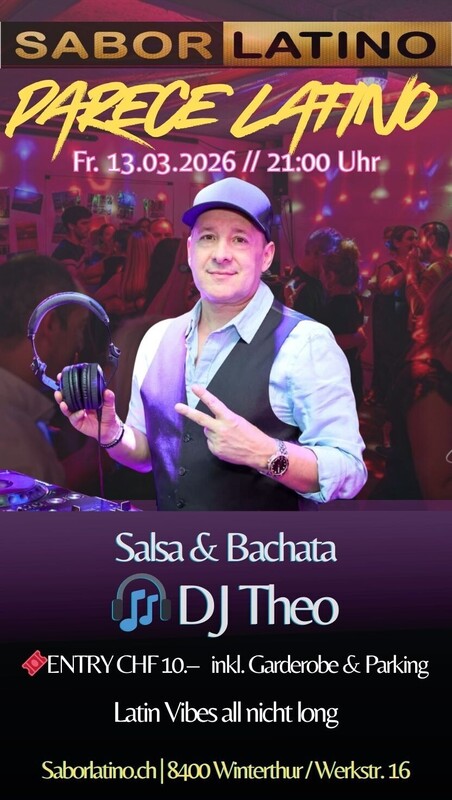 Parece Latino – Salsa & Bachata Fridays im Sabor Latino Freitag ist Latino-Zeit! 💃🕺 Parece Latino ist deine wöchentliche Salsa- & Bachata-Party im Sabor Latino – jeden Freitag (ausser am 3. Freitag) mit wechselnden DJs und bester Tanzstimmung. Diese Woche sorgt DJ Theo für feinste Salsa- & Bachata-Sounds und garantiert eine volle Tanzfläche, gute Vibes und lange Nächte. Egal ob Anfänger:in oder erfahrene:r Tänzer:in – hier findest du alles, was du für einen perfekten Tanzabend brauchst: ✨ gute Musik ✨ viel Platz zum Tanzen ✨ eine offene, herzliche Community ✨ Bar, Garderobe & Parking inklusive Komm vorbei und starte dein Wochenende mit Parece Latino! Im Sabor Latino gibt es auch eine Tanzschule: www.bailemos.ch https://saborlatino.ch/events/parece-latino/