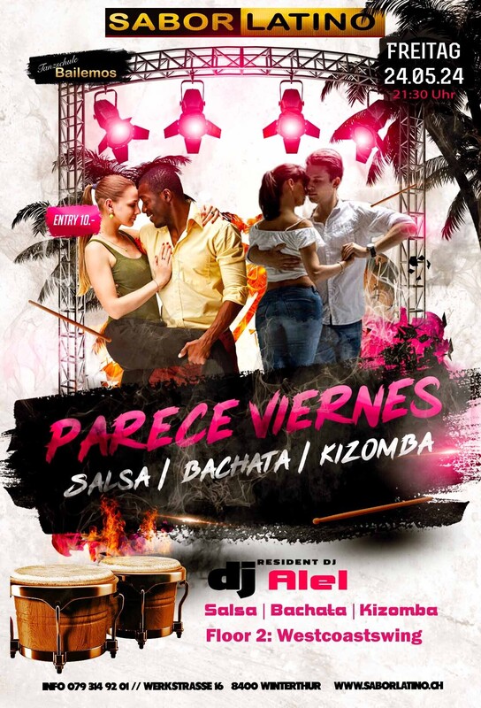 Die richtige Party, um das Wochenende zu beginnen. Mit wechselnden DJ`s immer Salsa, Bachata und Kizomba und auch mal Reggaeton. DJ Alel: Salsa, Bachata, Kizomba Free Parking vor dem Club und mit dem ÖV ist das Sabor Latino einfach erreichbar bis Haltestelle Grüzenstrasse oder Brücke. Auch die Nachtbusse fahren im 1/2 Stundentakt an und ab diesen Haltestellen. Im Sabor Latino gibt es auch eine Tanzschule: www.bailemos.ch www.saborlatino.ch