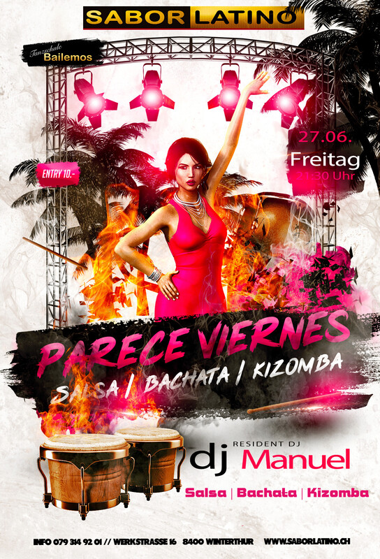 Die richtige Party, um das Wochenende zu beginnen. Mit wechselnden DJ`s immer Salsa, Bachata und Kizomba und auch mal Reggaeton. DJ Manuel: Salsa, Bachata, Kizomba Free Parking vor dem Club und mit dem ÖV ist das Sabor Latino einfach erreichbar bis Haltestelle Grüzenstrasse oder Brücke. Auch die Nachtbusse fahren im 1/2 Stundentakt an und ab diesen Haltestellen. Im Sabor Latino gibt es auch eine Tanzschule: www.bailemos.ch www.saborlatino.ch