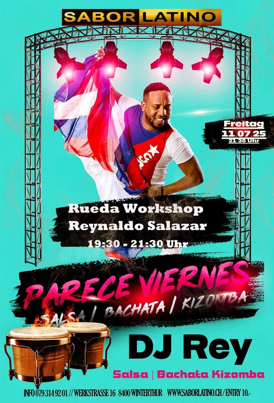 Die richtige Party, um das Wochenende zu beginnen. Mit wechselnden DJ`s immer Salsa, Bachata und Kizomba und auch mal Reggaeton. DJ Rey: Salsa, Bachata, Kizomba 19:30 - 21:30 Ruedaworkshop mit Reynaldo für geübte Salsatänzer:innen // WS + Party 40.- Anmeldung: https://bailemos.ch/salsa-rueda-workshop/ Free Parking vor dem Club und mit dem ÖV ist das Sabor Latino einfach erreichbar bis Haltestelle Grüzenstrasse oder Brücke. Auch die Nachtbusse fahren im 1/2 Stundentakt an und ab diesen Haltestellen. Im Sabor Latino gibt es auch eine Tanzschule: www.bailemos.ch www.saborlatino.ch