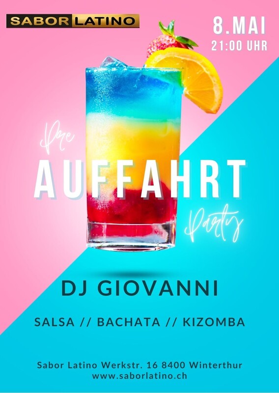 gerne laden wir Euch ein zu unserer Salsa, Bachata und Kizombaparty vor Auffahrt. Geniesst eine Nacht voller Tanz und Freude zur mitreissender Musik unserer DJ. Lasst uns zusammen das Tanzbein schwingen und auf das lange Wochenende anstossen. DJ Giovanni Salsa / Bachata / Kizomba www.saborlatino.ch