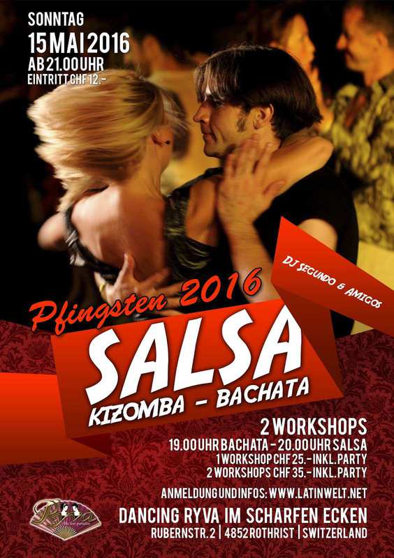 Latin Welt & Dancing RYVA präsentieren: 2 WORKSHOPS DJ SEGUNDO & AMIGOS Erleben Sie schöne und glückliche Momente! 100% Salsa, Bachata, Kizomba, Semba, cha cha INSTRUKTOREN: Segundo Valencia (ECU) & Vera Junker (CH) 19.00 Uhr - Bachata Sensual Partnerwork 20.00 Uhr - Salsa Partnerwork 21.00 - 02.30 Uhr Party PREISE: 2 Workshops inkl. Party CHF 35.- 1 Workshop inkl. Party VHF 25.- "beide Workshops sind für Einsteiger und Fortgeschrittene geeignet, Der Workshops setzt Vorkenntnisse voraus." Eintritt CHF 12.- "Reservieren Sie ihr Eintrittsticket (Workshops + Party) und sparen Sie bis CHF 10.-, Die Reservation gilt als Vorverkauf und wird vor Ort bezahlt." Haben Sie eine Latinweltkarte oder Latino Card gewähren wir Ihnen gerne einen Discount. Reservationen, Anmeldungen und Informationen: info@latinwelt.net I 078 800 49 12 I www.latinwelt.net Top Djs - Parkett Tanzboden - über 280 Gratis Parkplatz Wir freuen uns auf Ihren Besuch und auf einen unvergesslichen Salsa Abend. Dancing RYVA Team und LatinWelt.net