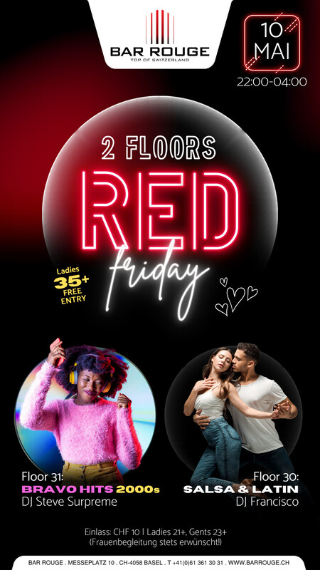 Schwinge im 30. Stock deine Hüften zu heissem, leidenschaftlichem und mitreissendem Salsa & Latin! Oder zeige uns deine Dance Moves im 31. Stock zu Bravohits 2000s und geniesse gemeinsam mit uns die atemberaubende Aussicht über ganz Basel. Join the club! Music: _Floor 30: Salsa, Bachata, Latin _Floor 31: Bravohits 2000s https://www.barrouge.ch/de/events/redfriday10052024/