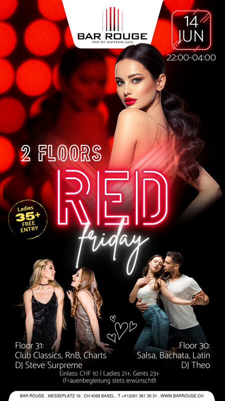 Geniesse die ultimative Party auf 2 Floors! Schwinge im 30. Stock deine Hüften zu heissem, leidenschaftlichem und mitreissendem Salsa & Latin! Tanze mit uns durch die Nacht bis es hell wird. Join the club! Music: _Floor 30: Salsa, Bachata, Latin _Floor 31: Club Classics, RnB, Charts https://www.barrouge.ch/de/events/redfriday14062024/
