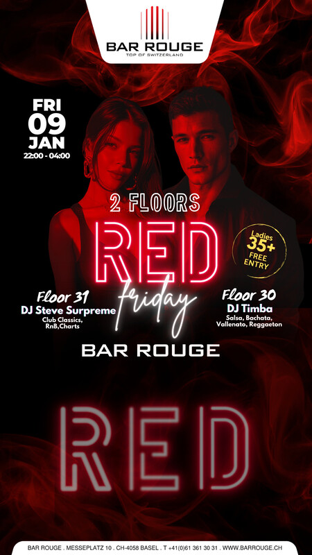 Geniesse die ultimative Party auf 2 Floors Zeige uns deine Dance Moves im 31. Stock zu Club Classics, RnB & Charts und geniesse gemeinsam mit uns die atemberaubende Aussicht über ganz Basel. Oder schwinge im 30. Stock deine Hüften zu heissem, leidenschaftlichem und mitreissendem Salsa & Latin! Tanze mit uns durch die Nacht bis es hell wird. Join the club! https://eventfrog.ch/RedFriday09012026