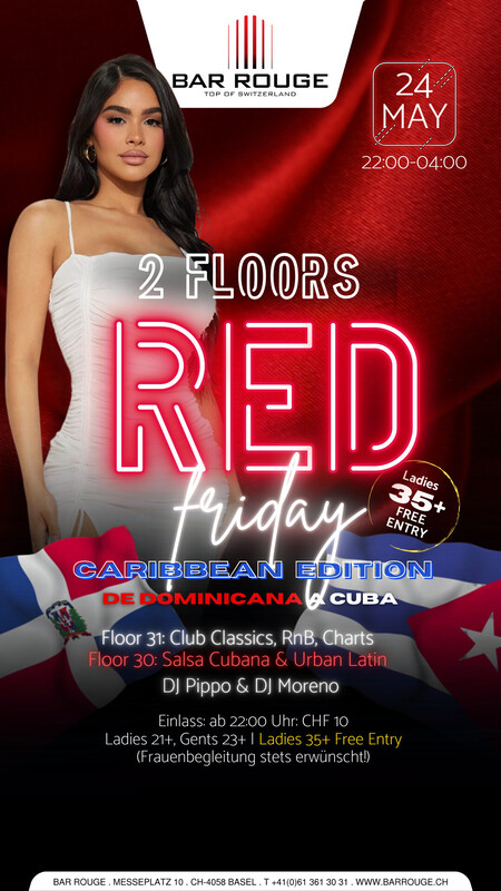 Every Friday is RED FRIDAY! Die sagenhafte Partyreihe geht in die nächste Runde. Im 30. Stock bringen wir mit Caribbean Edition das karibische Flair nach Basel! Im 31. Stock servieren wir dir Top 50 Charts, Pop, Hip Hop, RnB und vieles mehr. Music: _Floor 30: Salsa Cubana, Bachata & Urban Latin _Floor 31: Top50 Charts, Pop, HipHop, RnB https://www.barrouge.ch/de/events/red-friday24052024/