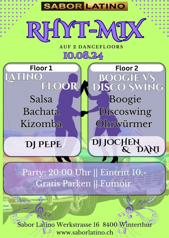 Rhyth-Mix, die Party auf 2 Dancefloors die verschiedene Rhythmen und Tanzstile vereint. Auf dem Latino Floor legt der DJ Salsa, Bachata und Kizomba auf. Auf dem Standard Floor wird von Boogie Woogie, Disco Swing, Jive und auch mal Walzer gespielt. Latin Floor: DJ Paquito Standard Floor: DJ Jochen & Daniela Discoswing vs. Boogie Woogie https://saborlatino.ch/events/rhyth-mix/