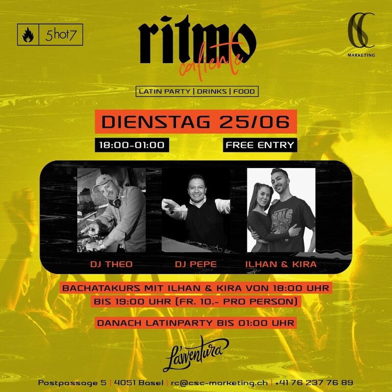Bereit, deine Dienstage zum Glühen zu bringen? 🌟 Ritmo Caliente jeden Dienstag auf der atemberaubenden Dachterrasse von L`avventura (Postpassage 5, 4051 Basel) statt. Geniesse die heissesten Latin Beats, erfrischende Drinks und köstliches Essen – alles bei freiem Eintritt! 💃🕺 Am 25. Juni 2024 mit DJ Pepe und DJ Theo. Bachata-Workshop mit Ilhan & Kira von 18:00 Uhr bis 19:00 Uhr. Kosten für die Teilnehmer Fr. 10.- pro Person #RitmoCaliente #LatinParty #BaselEvents