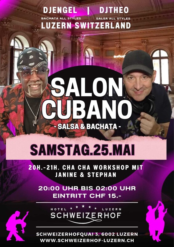 ★ SAMSTAG 25. MAI 2024 ★ Herzlich Willkommen im LEGENDÄREN ★ SALON CUBANO ★ des 5-Sterne-Hotels Schweizerhof Luzern. SALON CUBANO mit 2 Dance Floors Salsa All Styles - Bachata All Styles ★ 20h-21h. Cha Cha Workshop mit Janine & Stephan - SALSA FLOOR (360 m2): Salsa All Styles mit DJ Theo - BACHATA FLOOR (95 m2): Bachata All Styles mit Gast DJ Engel ★ 20:00 Uhr bis 02:00 Uhr - Eintritt CHF 15.- Inkl. Cha Cha Workshop DAS 5 STERNE HOTEL SCHWEIZERHOF LUZERN liegt direkt am Vierwaldstättersee und in unmittelbarer Nähe zum Stadtzentrum von Luzern. ------------------------------------------------------------------ ★ ZEUGHEERSAAL: (Salsa Floor) DJ Theo ----------------- Der prächtige Festsaal ist unser Juwel. Der im Jahr 1865 erbaute Ballsaal ist ideal für Grossanlässe mit bis zu 500 Personen und 360 Quadratmeter Tanz-Parkett. ★ WINTERGARTEN: (Bachata Floor) DJ Engel ----------------- Mit seinem kunstvollen Glasgemälde an der Decke ist besonders beliebt für Kleinanlässe mit bis 80 Personen und 95 Quadratmeter Tanz-Parquett. ------------------------------------------------------------------ Viele Parkplätze Möglichkeiten in der Nähe: www.parking-luzern.ch HOTEL SCHWEIZERHOF LUZERN Schweizerhofquai 3, 6002 Luzern www.schweizerhof-luzern.ch https://www.facebook.com/events/384662817890585/