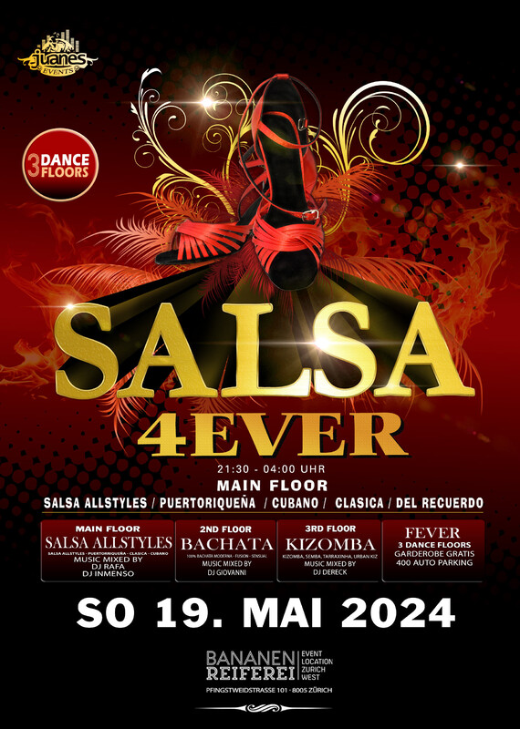 ✽ SALSA 4EVER ✽ ALL STYLES Pal Bailador, 3 Floors Bananenreiferei ● SONNTAG 19. MAI 2024 ● 3 DANCE FLOORS ✽✽✽✽ SALSA 4EVER ist die Party für den guten Tänzer, eine Juanes-Party, die alle Stile anbietet, von Salsa Allstyles bis Puertorriqueña, Cuban, del Recuerdo und Classical Salsa. Du kannst Deinen Lieblingsstil mit unseren Super Salsa DJs geniessen, die sich bewusst sind, dass wir hier Salsa für den Tänzer spielen. ✽✽✽✽ ● DOORS: 21:30 – 04:00 UHR ● EINTRITT CHF 20.- ● EINTRITT: BEZAHLUNG AN DER KASSE NUR BARGELD ● GRATIS GARDEROBE ● 400 AUTO PARKPLÄTZE ✽✽✽✽ ● 1-MAIN FLOOR: * SALSA ALLSTYLES ● DJ RAFA ● DJ INMENSO Salsa Allstyles, Puertorriqueña, Cubana, ChaChacha, Salsa pal Bailador ✽✽✽✽ ● 2ND FLOOR: BACHATA: ● DJ GIOVANNI ✽✽✽✽ ● 3RD FLOOR: KIZOMBA: ● DJ DERECK ✽✽✽✽ BANANENREIFEREI Pfingstweidstrasse 101 8005 Zürich ✽✽✽✽ SEARCH MAP https://map.search.ch/Bananenreiferei,Z%C3%BCrich... ✽✽✽✽ Bienvenidos Juanes Events https://juanesevents.ch/ ✽✽✽✽ FOLLOW US in INSTAGRAM Noche Cubana https://www.instagram.com/noche_cubana_juanes/ ✽✽✽✽ FOLLOW US in INSTAGRAM https://www.instagram.com/bachata_fever_juanes/ ✽✽✽✽ OFFICIAL JUANES EVENTS FACEBOOK https://www.facebook.com/juanesevents http://juanesevents.ch/