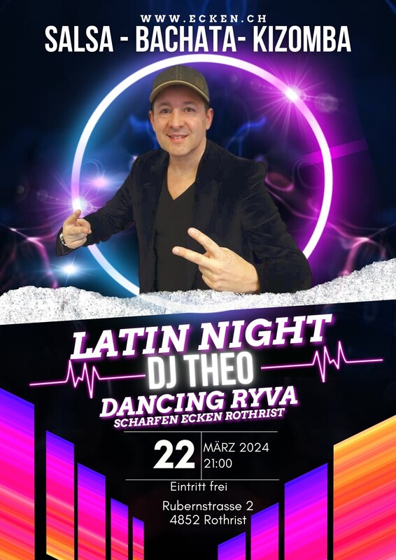 Freitag 22. März 2024 ab 21h. IMMER DER LETZTE FREITAG VON JEDEN MONAT Eintritt ist Frei ★ SALSA & FIESTA ★ Herzlich Willkommen ins Dancing RYVA im Scharfen Ecken SALSA ALL STYLES - BACHATA - LATIN HITS ★ ★ DJ THEO ★ ★ ---------------------------------------- ★ PROGRAMM: 21:00 Uhr bis 02 Uhr Salsa Party mit DJ Theo Grosse Parkett Tanzboden ---------------------------------------- ★ Frei Eintritt ---------------------------------------- ★ 280 Gratisparkplätze ★ 3 minuten von Autobahn Ausfahrt Rothrist ★ 35 min. ab Luzern, 40 min. ab Zürich, 30 min. ab Basel, 40 min. ab Bern ★ Pizzeria The Fratelli & Restaurant Scharfen Ecken ---------------------------------------- ★ Nach dem Essen im Restaurant oder in der Pizzeria The Fratelli schenken wir Ihnen den Eintritt für jeweils Dienstag, Freitag oder Samstag. ---------------------------------------- DANCING RYVA zum scharfen ecken Rubernstrasse 2 I 4852 Rothrist I Kanton Aargau I www.ecken.ch Dancing RYVA im Scharfen Ecken ★ Der Ort wo man sich trifft, tanzt und flirtet. Erleben Sie schöne und glückliche Momente. Wir freuen uns auf Euren Besuch Euer RYVA TEAM – Scharfen Ecken Rothrist 🎉 Latino Night im Dancing RYVA! 🎉 Sei Teil einer unvergesslichen Latin Night, präsentiert von DJ Theo! 🔥🎶 Genieße eine heiße Mischung aus Salsa, Bachata, Kizomba und den besten Latin Charts. 🕺💃 Wir bieten dir eine riesige Tanzfläche, um deine Moves zu zeigen und die Nacht durchzutanzen. 🌟 Die Party startet um 21:00 Uhr und geht bis 02:00 Uhr. Der Eintritt ist Frei. Wir sehen uns im Dancing RYVA, Scharfe Ecken, Rothrist. Markiere deine Freunde und sei dabei! https://fb.me/e/54RylbLJK