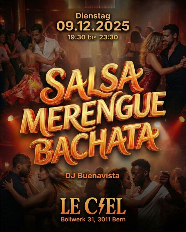T.U.S Events (Timba . Urbano . Sensual) Le Ciel Club 1 événements mardi 09 décembre 2025 19h30 SALSA BERN Avez-vous été à cet événement? Ajouter vos photos! BIG NEWS in Bern – Club Le Ciel 🎶 Mach dich bereit für eine heiße Nacht voller Salsa, Merengue und Bachata! 🗓 Dienstag, 9. Dezember 2025 🕢 Von 19:30 bis 23:30 Uhr 📍 Club Le Ciel – Bollwerk 31, 3011 Bern 🎧 DJ BUENAVISTA 💸 Eintritt: 10 CHF Prix d'entrée: CHF 10.00 Share on Facebook Événements mar, 3. mar. 19:30 SALSA URBAN BACHATA BERN Le Ciel Club Bern